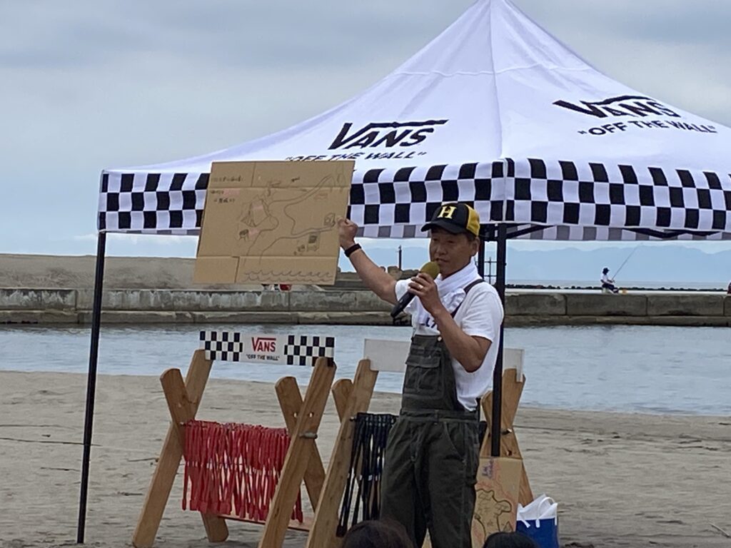 環境セミナー講師は、この浜と地元の人をよく知る綱本さんと、日本でもっとも意欲的に行われている環境活動と同じ熱量をこの浜に伝えてくれる能勢さん。