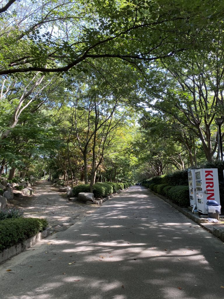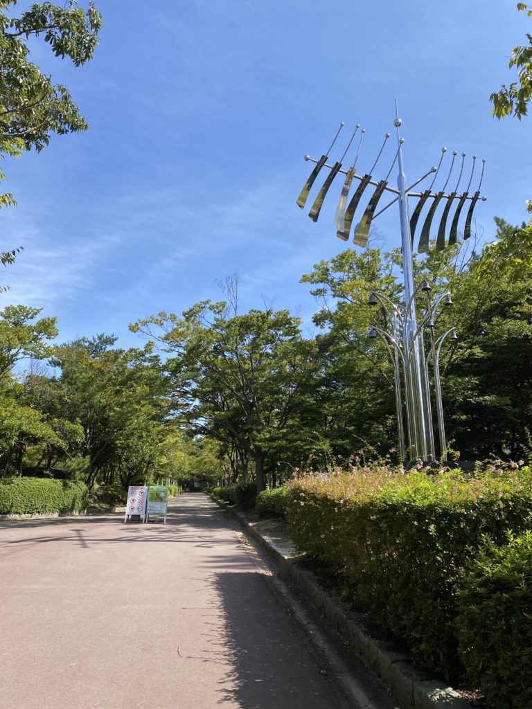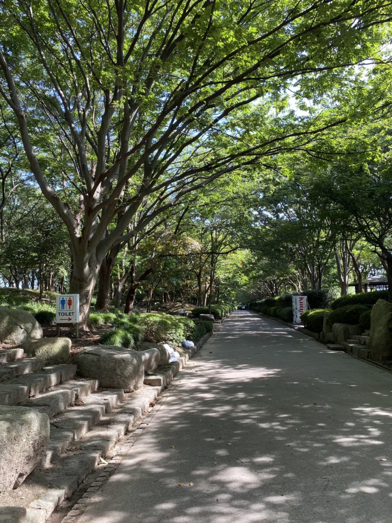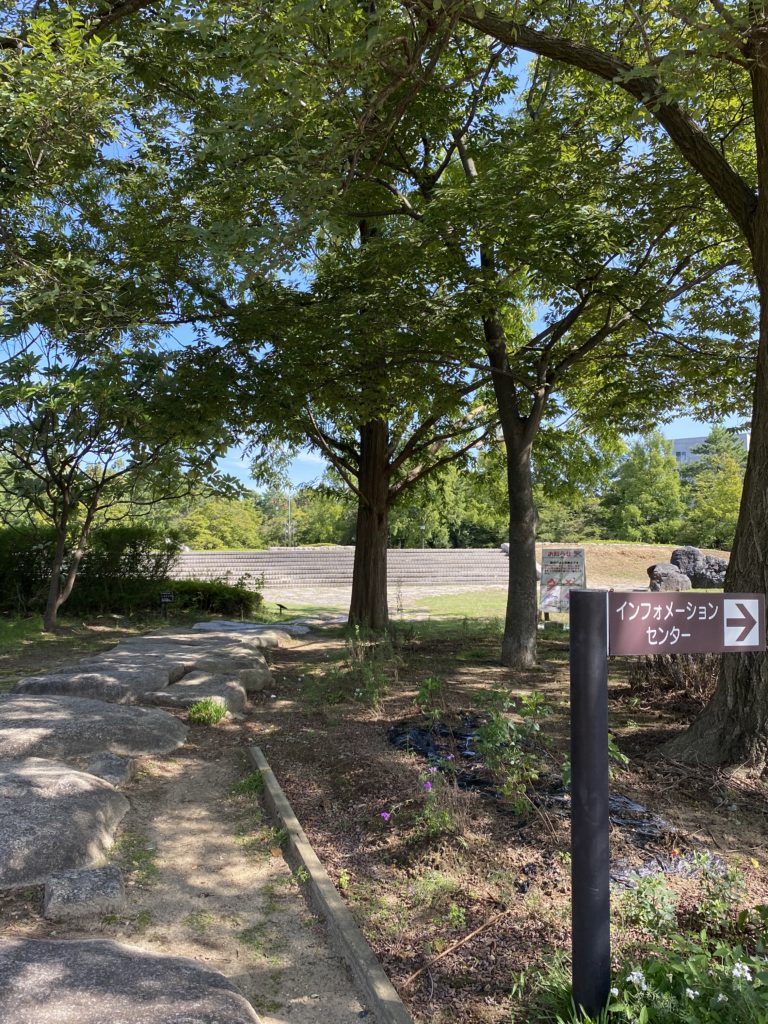 駐車場から見える木々の方面に歩くと、右手にメイン広場の階段が見えます。