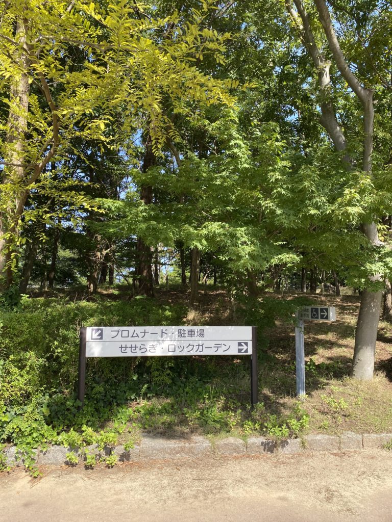木々の方面に歩くと案内看板がありますので、右のせせらぎ・ロックガーデン方面へ遊歩道をお進み下さい↓