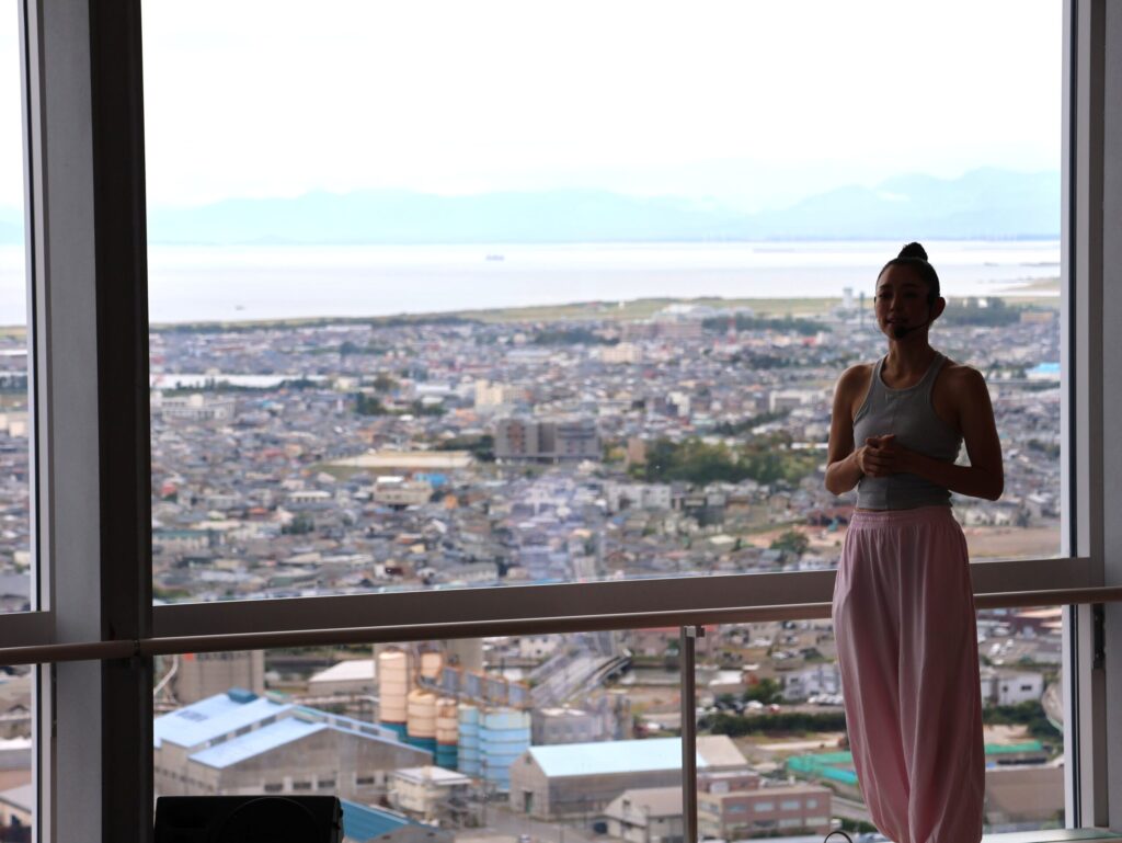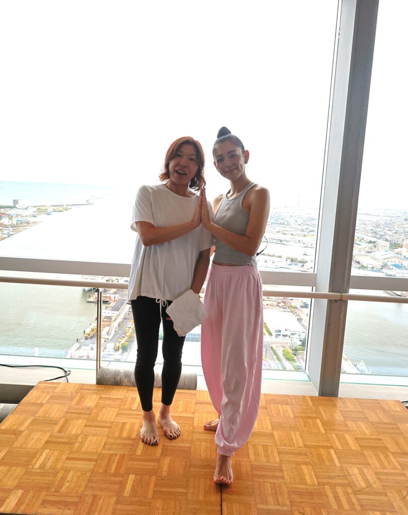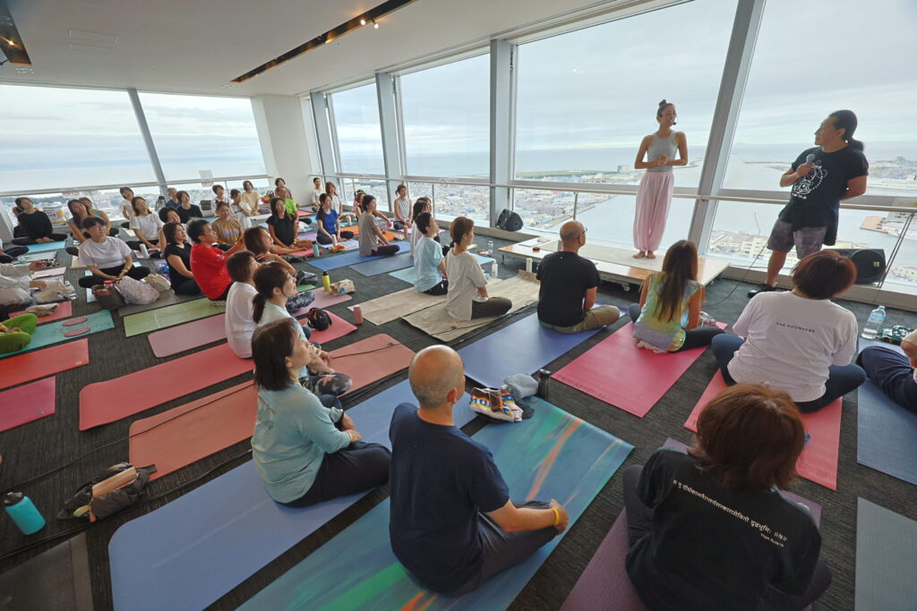広大な日本海と白い空の中でプレミアムなゲスト講師ヨガをご体験いただきました。